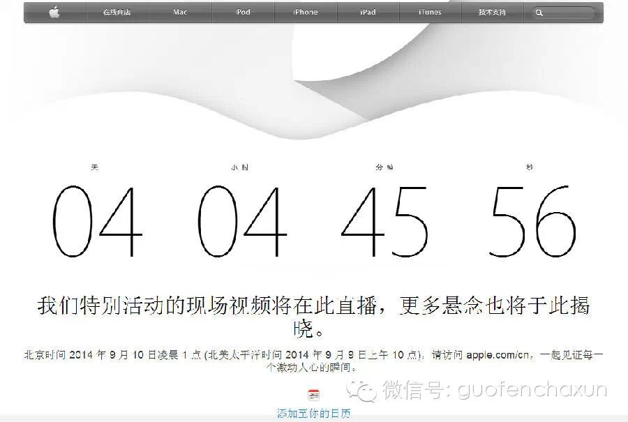 对于大部分“果粉”而言,注定无法去现场参与发布会,没关系,苹果刚刚宣布,将提供9月9日媒体发布会的直播视频,目前,苹果已经在英文、中文官网挂上了倒计时,并开设了发布会的视频直播入口。在直播介绍页面,苹果提到:“我们特别活动的现场视频将在此直播,更多悬念也将于此揭晓。”,并邀请大家见证每一个激动人心的瞬间。