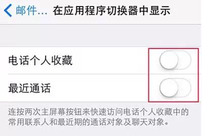 发布于2015年3月4日 由guofen苹果手机顶部的最近联系人如何删除? 大家按照以下方式就可取消顶部的最近联系人显示: 进入系统【设置】,点击进入【邮件、通讯录、日历】选项 在该界面中再一直往下拖,选择【在应用程序切换中显示】 进入该选项中,会出现如下图所示界面,关闭【电话个人收藏】和【最近通话】这二个选项即可。 就这样,最近通话记录轻松被隐藏了。