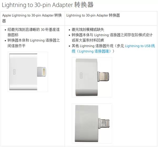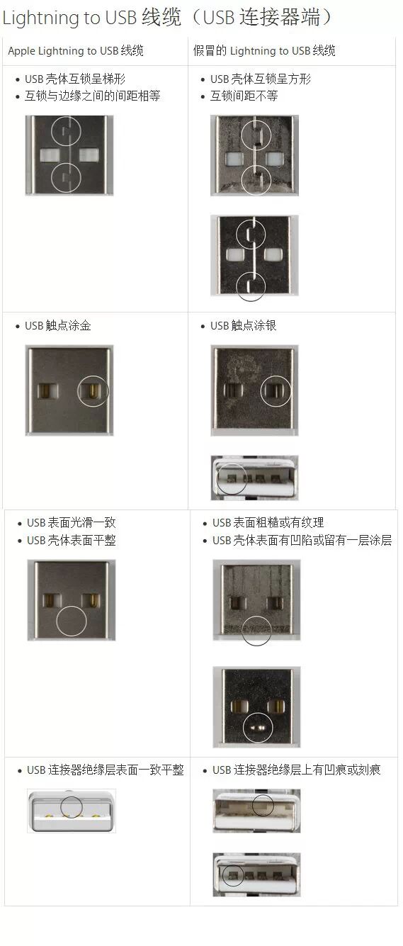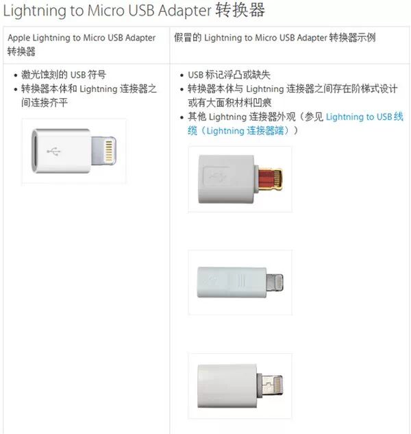 Lightning数据线是Apple自己的发明,要生产带有这插口的线路和周边都需要Apple认可。不过连iPhone6的山寨货都有,何况是iPhone配件Lightning数据线?山寨Lightning虽然价钱便宜,却有可能损坏装置。如果你怕买到假货,就要懂得分辨真假了。对此,Apple在官网贴出一个《识别假冒或未经认证的 Lightning 连接器配件》,详细教大家如何分辨真假Lightning。