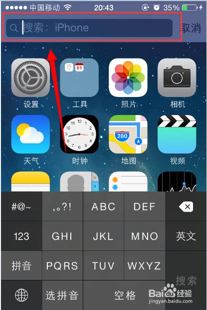 在屏幕任何位置按住向下拉就能调出搜索框,直接输入APP的字母或汉字就能自动检索和显示出符合条件的APP....