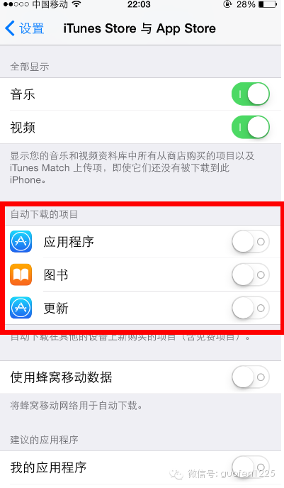 修改路径:设置——iTunes Store与App Store——使用蜂窝移动数据,关闭。(其实最好把上面的“应用程序、图书、更新”都关闭吧,这样就万无一失了!)
