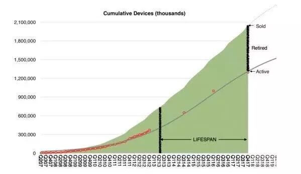 他根据 iOS 累销量和活跃用户数量,再对比往年累计销量相近的季度,就推算出了 iOS 设备的平均使用寿命。