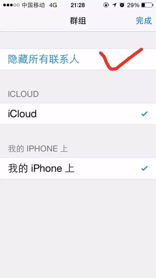 选择 隐藏所有联系人 (iOS8.4版本取消勾选 所有联系人 即可)