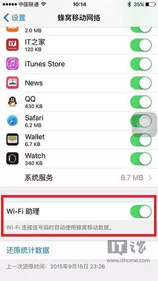 iOS9中增加了一个新功能 - WiFi助理:在无线局域网连接信号弱时自动使用手机蜂窝网络。由于WiFi助理功能是默认打开的,这就可能造成数据流量在用户不知情的情况下跑掉。当然苹果出发点是好的,但是考虑到中国的情况,iOS9中默认关闭WiFi助理功能会更好。