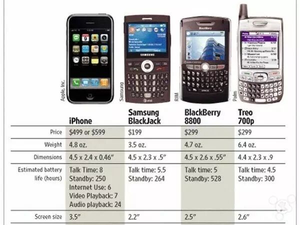 没有物理键盘,没有手写笔,整个手机的正面就是一块“巨大”的屏幕。当时最流行的智能手机是黑莓、摩托罗拉、Palm 的旗下产品,iPhone 的出现让世人知道“原来这样也行”。初代 iPhone 的屏幕尺寸为 3.5 英寸,320 x 480 分辨率,其处理器频率只有 400 MHz,128MB的运行内存,最高 16GB 容量,200 万像素后置摄像头。