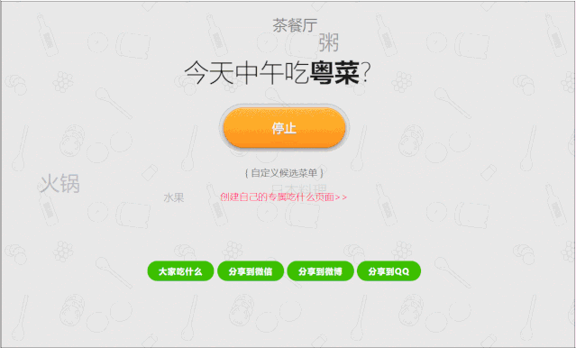 就是这个叫做“中午吃什么?”的网站,进入之后点击上方的“开始”,这时候界面会飘满了各种好吃的的名字。然后根据你的个人感觉,按下“停止”即可,你要是不想吃的话,点击“不行,换一个”继续研究就可以啦。呔咯在第一波玩的时候,出现的是“今天中午吃米线!”我们今天中午真的点了个米线哟,喵喵喵...刚刚进入网站的时候,上方就有关于吃的分类,比如:大家吃什么,最热吃什么...点击“最热吃什么”,上面还会出现“异性网友第一次见面吃什么”,中午加班吃什么等等。选择创建吃什么的话,会需要登录一下,小伙伴们怎么方便怎么来就行。反正呔咯觉得这个网站还是很靠谱的,你们怎么看呢?喵~想要去这个网站看一看的小伙伴在微信公众号「呔咯喵」后台回复“吃什么”即可获取。最后奉劝大家一句,别玩得太开心,把自己午饭时间给玩没了~这个网站强不强