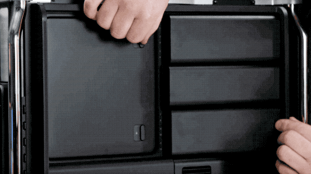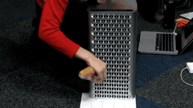 哎妹:你好像有点飘了腹黑的咆哥开始寻找相关的暴力评测,这么贵的产品,不敲敲打打总感觉差点意思。很可惜,只找到了用它削奶酪的视频,事实证明土豪们可以买一台回去削土豆了。哈哈,不过我意外发现拆解网站 iFixit 终于对 Mac Pro 下手了,最后的结论是「这款产品非常容易拆解,并且设计细节很有意思」。iFixit 还给出了 9 分的可修复性得分(满分10分,分数越高越容易拆解维修)。首先是 Mac Pro 的外壳,只要在顶部旋转一下把手就能直接拉开,很是方便。在 Mac Pro 里,CPU 风扇、显卡、主板等部件的连接,再到机箱外部的开关、外部 USB 接口等,都没有用到线。这就是咱们口中一直说的「模块化」产品,机箱里的盖板都是通过「卡扣」的形式安装。只要轻轻一按,就会自动弹开,取内存条这种操作自然是手到擒来。Mac Pro 的显卡右下角有个卡扣,轻轻一按,显卡就卸下来了。同样,电源也用不着线,直接把它从接口里拔出来就行。顺带提一句,如果你不想用苹果那么贵的内部硬件,可以选择自己换 CPU 和内存条。另外,Mac Pro 内置的固态硬盘虽然可以移动,但是由于集成了 T2 芯片,所以大家没办法手动更换。其他的像是三个大风扇、导热管、散热片等等,拿个螺丝刀就能拆明白。到这里,Mac Pro 的主板也拆的差不多了,拿下来看它确实很精致。总之。Mac Pro 为啥这么贵也能理解了:用料实在,配件给力,拆装方便。说到这里,咆哥觉得不要用普通消费者的眼光来看这台机器,就像你买台手机送了个耳机,为什么还要在花钱买个「蓝牙耳机」一样的道理。Mac