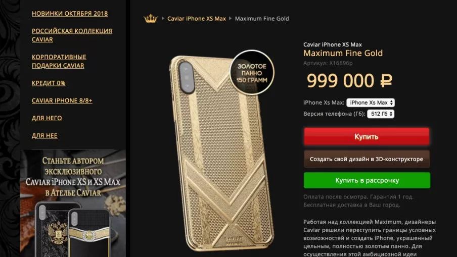 经常为土豪们打造一些纯金的 iPhone,比如机身使用了150克纯金的 iPhone XS Max ,512GB 版本售价达到了999000卢布,约合人民币102998元。