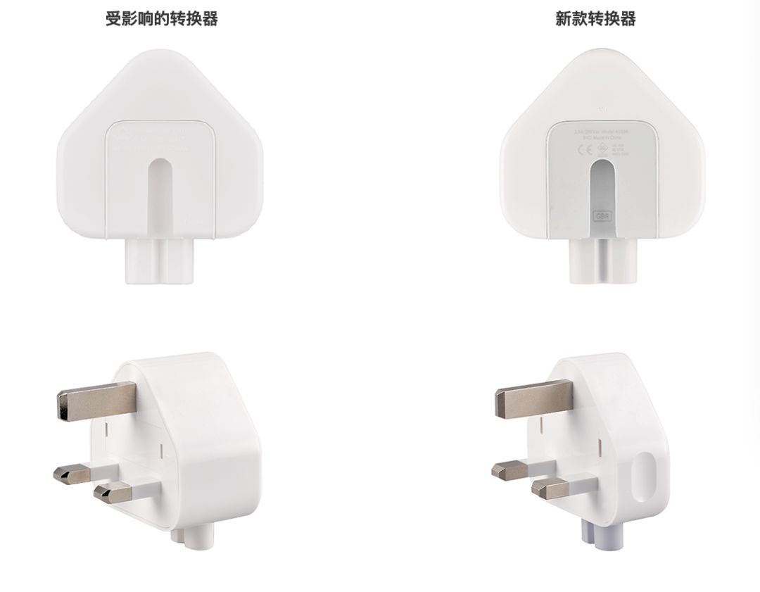 受影响的三插插头转换器为白色,在其连接 Apple 电源适配器的内插槽中没有字母。新款转换器亦为白色,但其连接电源适配器的内侧部分是灰色的。